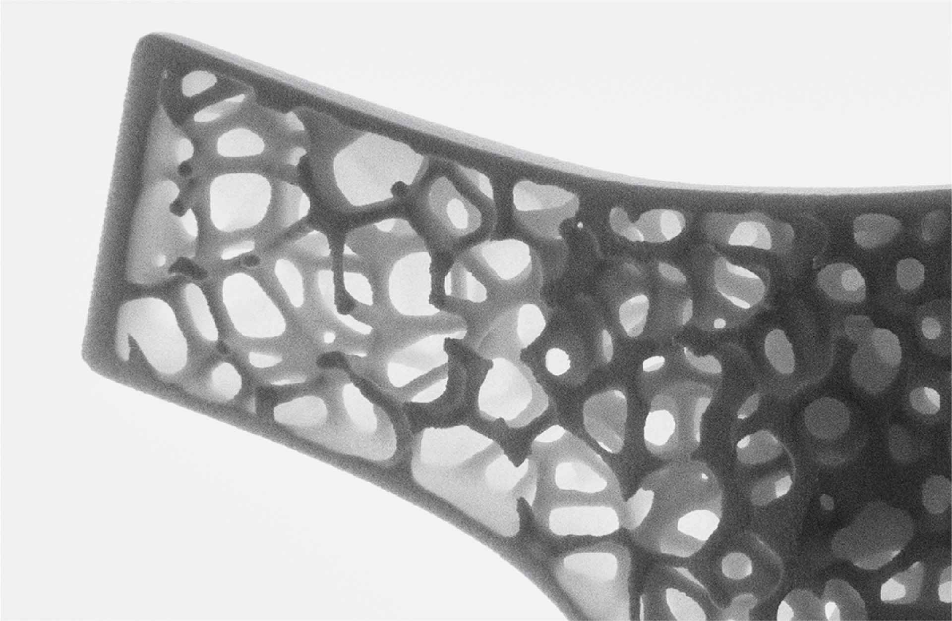 In order to keep the stick as lightweight as possible, without compromising its structural integrity, an internal porous structure, mimicking the trabecular bone tissue, has been developed exclusively for Shiro Studio by MHOX Design and engineer Vincenzo Reale of Arup, using generative design.