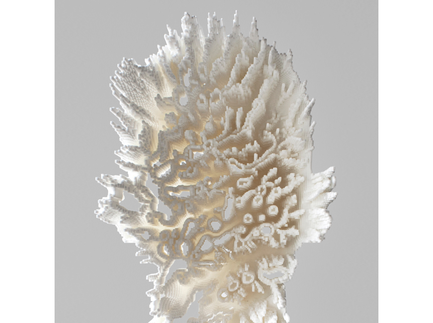 Postnatural Head is generated through an algorithmic simulation of erosion, and consists of approximately forty thousand unique elements, materialised through 3D printing. While their cross-section remains constant, variations in length and displacement follow a complex pattern, whose perception changes significantly depending on the viewer’s angle and position.